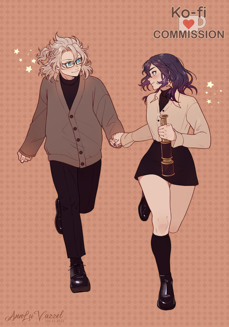 ▪ It will also be helpful to know your social media username (Twitter/ Instagram/ Tumblr) so we can discuss other details via DM and mention you as the commissioner once I post your commissionConfirmation: Once I receive the payment, I will contact you to let you know your commission's number in the wait-list and discuss additional details (if needed).Additional payment: If additional payment is needed once the details are discussed (fees for complicated character design, background or additional characters) I will ask you to pay it using Ko-fi's "Tip" menu that is on my Ko-fi page.! I can refuse the commission if it makes me uncomfortable or I think it doesn't fit my style/skills. In this case, I will ask you to change your request or refund your payment. If you are not sure whether your commission is appropriate for me or not, dm me on Twitter or Instagram first and ask. No judgment, but please respect my boundaries if I refuse it.Working on the commission: I will notify you once I start working on your commission, and ask for your approval after each stage (rough draft, lineart, coloring)▪ The commission should be finished in a time frame ranging from a week to a month. This time, however, can vary depending on your place in the wait-list and complexity of your commission and the ones requested before yours, so it may take longer than expected to start and finish the work. Also, please remember this is not a full time job for me, so I might have to deal with situations that make the waiting time longer (work, family, health, etc)